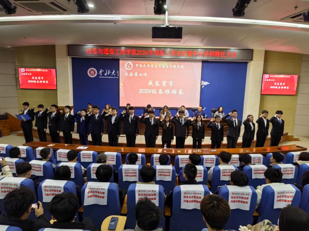 党委副书记魏媛媛对上一学年的“领航工程”工作进行了总结,回顾了项目在促进学生全面成长成才方面所取得的显著成效。同时也指出有待改进的方面,希望老师和同学们能够双向奔赴,共同成长。会议对2023/2024学年“领航工程”获奖班级及优秀班长进行了表彰,为2024级新生聘任了学业导师及科创导师。作为获奖班级代表,21050Z01班的学生上台进行了精彩的事迹汇报,他们分享了参与“领航工程”过程中的成长点滴与宝贵收获,充分展现了信通学子积极向上、勇于探索的青春风采。随后,2024级新生班长满怀激情地发表了成长宣言,他们眼神坚定,对未来充满了无限期待与美好憧憬。