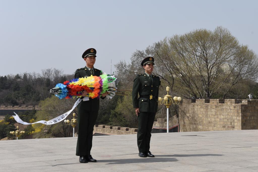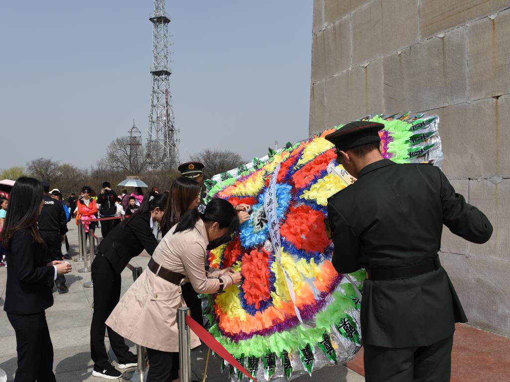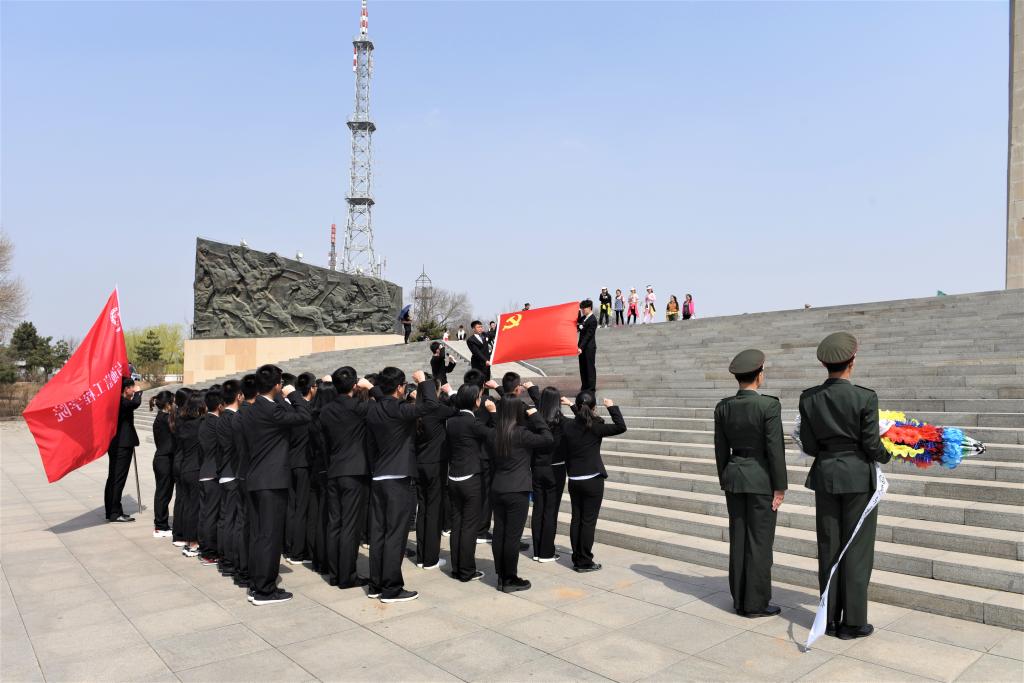 在卢宏伟同学的带领下,大家重温入党誓词,激发前行动力。 伴随着深情的《献花曲》,2名国旗护卫队队员抬起花篮,缓步走向百团大战纪念碑,摆放在纪念碑基座上。全体师生依次上前献上自己亲手制作的白花,并缓步绕行,瞻仰百团大战纪念碑。
