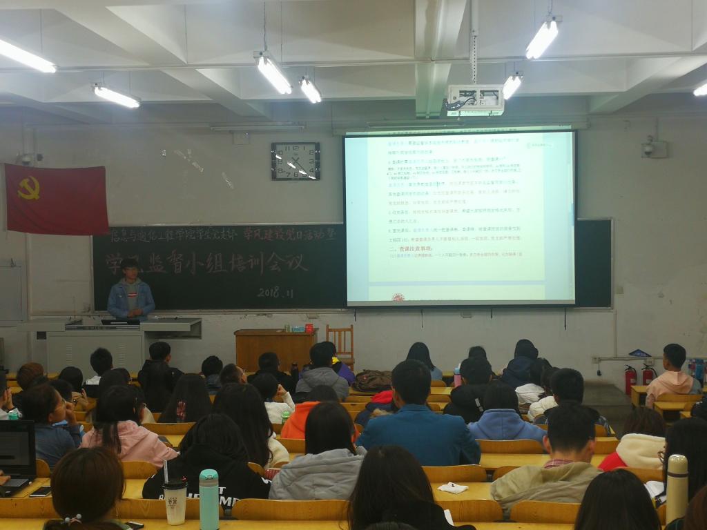 电子信息工程专业学生党支部副书记卢宏伟同学首先就《党员成长手册》以及朋辈学业辅导的内容进行了讲解,提出了每一位党员都应该以身作则,用自己所学的知识去帮助身边的同学。朋辈辅导工作以三个同学为一个学习小组,固定辅导一组课题内容,每周定时给低年级同学进行学业辅导。光电信息科学与工程专业学生党支部副书记余成臻同学对学风监督工作的具体要求进行了讲解,对查课过程中遇到的问题进行了逐一解答。