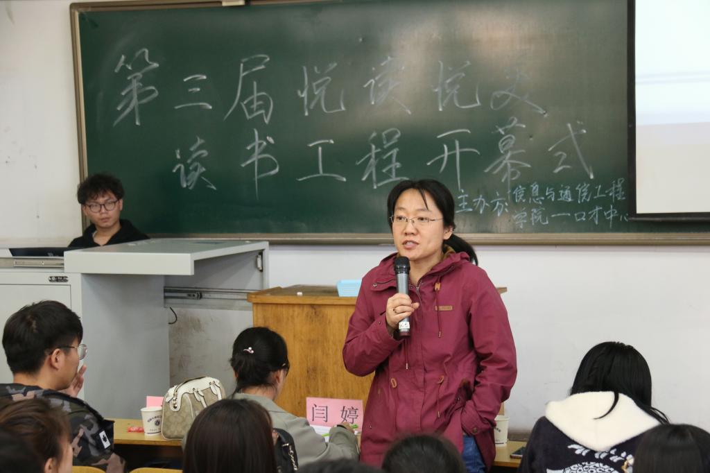 开幕式伊始,播放了三味书屋宣传视频,旨在让更多的同学养成阅读的良好习惯。接下来优秀主讲人展示的环节,三位主讲人分别对三本好书进行分享,有趣诙谐的言辞使看着平凡无奇的书籍焕发出无限的鲜活生命力,也令在场的同学们忍俊不禁,凝神倾听,现场气氛十分活跃。接下来《再别康桥》美文朗读,将厚重的文化力量和文本背后的深沉情感相结合,为现场师生带来了一次良好的视听体验。随后,闫婷老师宣读了本届读书工程活动的实施方案。最后,由魏媛媛老师做总结发言,她为我们讲明了读书的重要性,并倡导同学们要多读书,读好书。