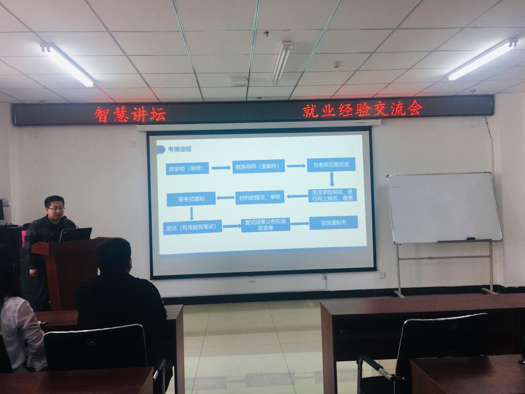 交流会交流会开始,首先由朱博秀同学将自己在研究生期间需要提高培养的知识储备做了一个详细的介绍,讲述了自己求职的必备技能和心路历程。接着刘旭明同学就自己的求职经历详细地为大家剖析了求职过程中需要注意的各种问题,认清自己,找准定位,做好充足的准备,明确定位后就朝着目标不懈努力。张鹏同学分享了自己考博的经历,从如何找金沙