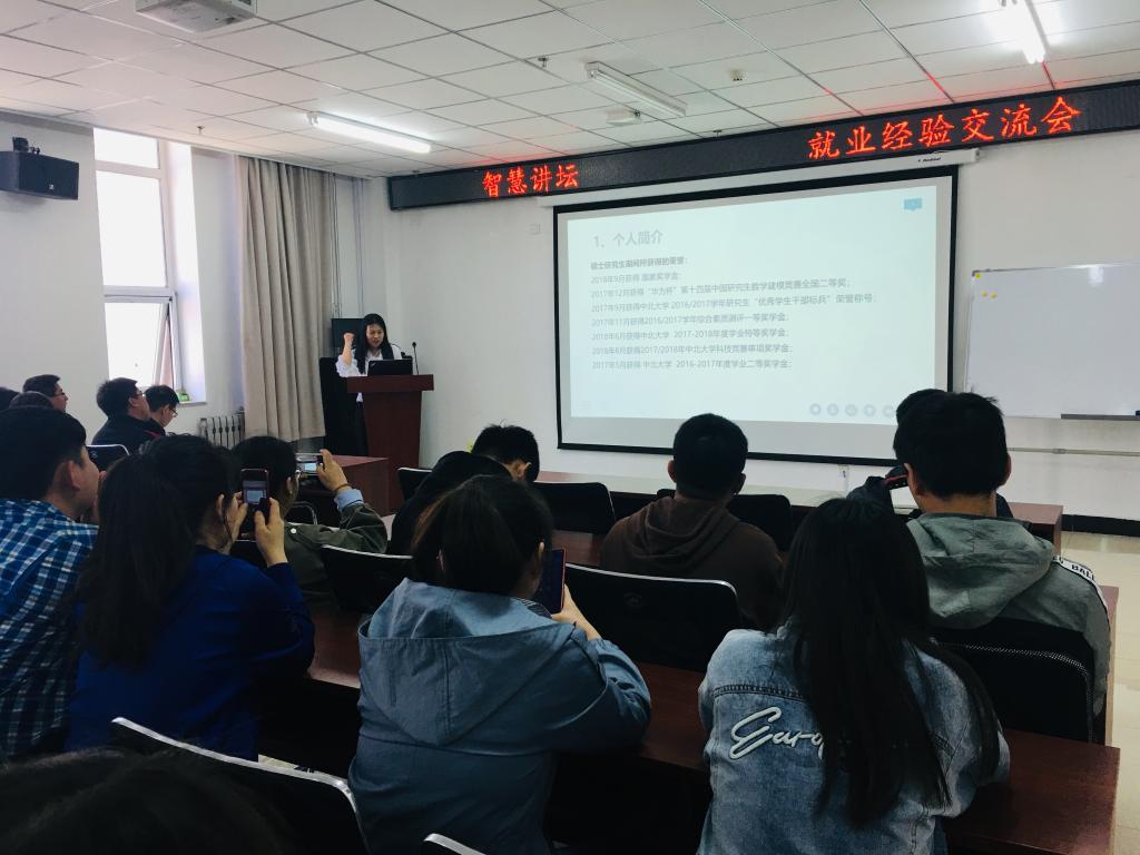 17级全体研究生在院楼715学术报告厅参加“智慧讲坛”暨2019届毕业生就业经验交流会。本次交流会的主讲人为即将入职工作以及读博深造的四位优秀毕业学子,他们介绍了关于自身定位、职业规划、行业选择、职位选择、简历制作、笔试面试等方面的经验,为即将面临求职或继续读博深造的17级研究生提供了宝贵的经验,对于以后的职业生涯规划提供了极具价值的信息分享。