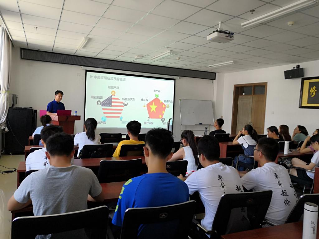 党委书记曹凤才老师,班会主题——中美贸易争端浅析。