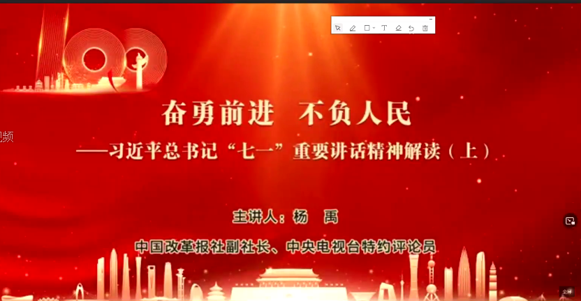 央视特约评论员杨禹老师以《奋勇前进 不负人民——习近平总书记“七一”重要讲话精神解读》为题,从横向理论经验总结到纵向百年大党发展历程,深入浅出地梳理了习近平总书记“七一”重要讲话全文。带大家回顾了中国共产党为实现中华民族伟大复兴的奋斗史;分析了习近平总书记围绕“以史为鉴,开创未来”提出的“九个必须”;解读了习近平总书记对全体中国共产党党员发出的新号召。