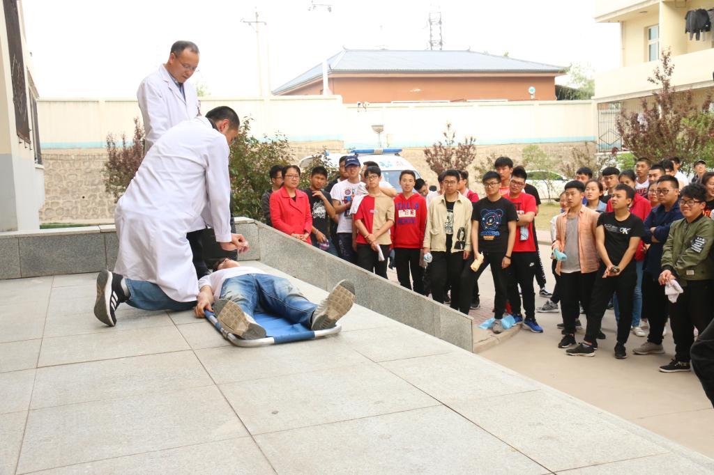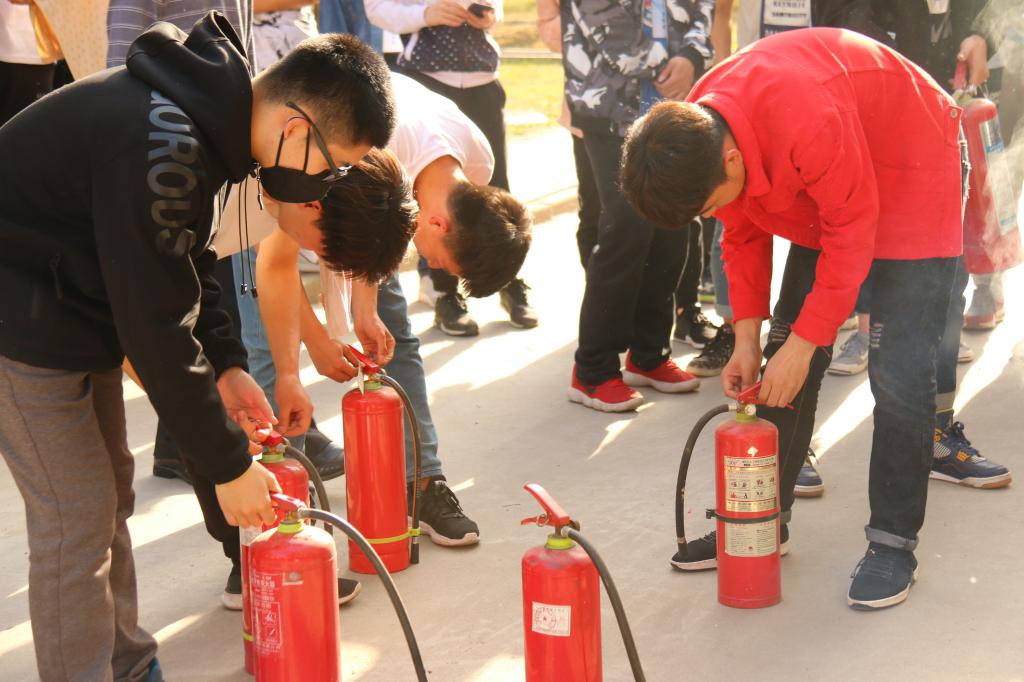 随着学生们在疏散引导组的疏散下迅速有序的撤离,后勤组人员立即拨打了报警电话。在撤离的过程中,有两名学生被困,救援组及时到位,救出被困学生,紧急送上救护车。在消防车到来后,火情得到了控制。演练基本结束后,由校医院医务人员为大家讲解了紧急救护知识,石老师为大家讲解了有关灭火器的的使用及注意事项并让大家近距离操作。