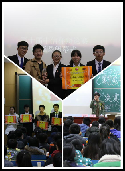第十届“中信杯”辩论赛于2015年12月5日在11409H迎来了决赛暨闭幕式。两支分别来自15050143班和15050342班的虎狼之师展开了一场激烈的角逐,最终以15050342的胜利圆满结束了第十届“中信杯”辩论赛。本次活动由金沙