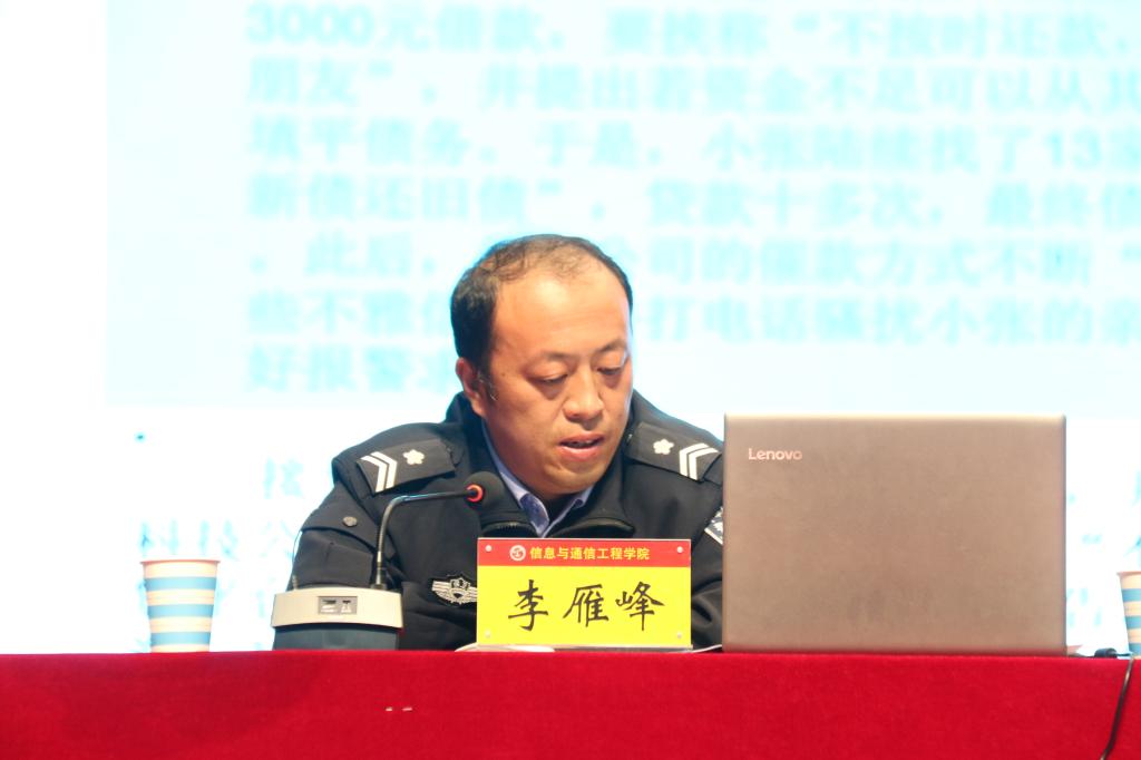 首先,李雁峰老师针对高校电信诈骗、盗窃案件、交通安全、人身安全、校园贷以及各类校园安全问题进行了详细的阐述,并通过鲜活的案例和同学们深入交流。