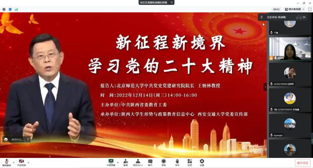 2022年12月14日下午,院党委组织全院师生党员在西安交通大学“思源直播平台”上线上聆听了北京师范大学中共党史党建研究院院长王炳林教授作题为“新征程新境界学习党的二十大精神”报告会。