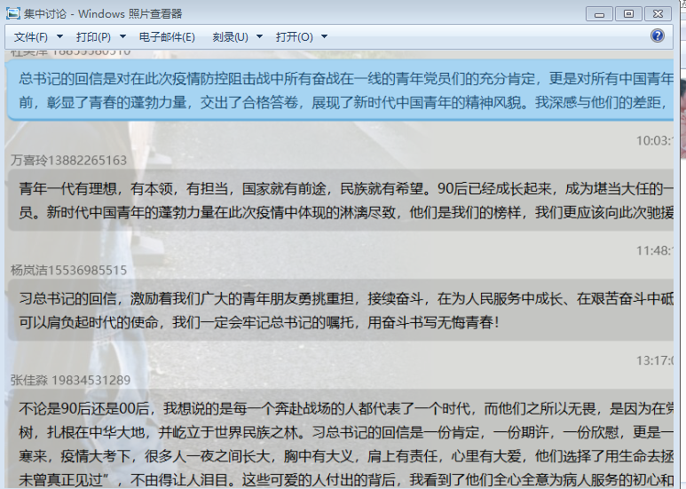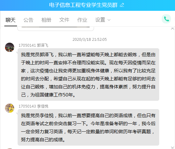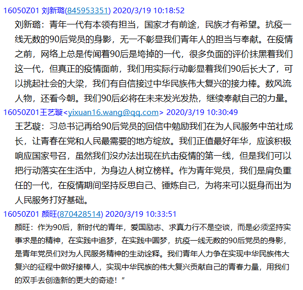 有的党员在群里发表感言:“‘你救了我的命,我却连你的样子都未曾真正见过’,这些可爱的人付出的背后,我看到了他们全心全意为病人服务的初心和为百姓健康谋福祉的使命。影射于己,作为一名学生党员,我意识到了自己的诸多不足,也深切地明了只有努力学习科学文化知识,练就过硬的本领,才能在国家和人民需要我的时候不假思索地挺身而出”。