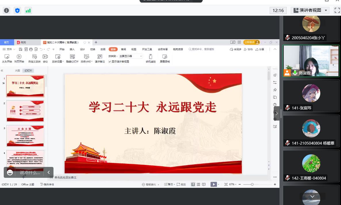 为深入学习宣传贯彻党的二十大精神,2022年12月10日晚19:00,电子信息工程学生党支部利用腾讯会议平台开展学习,党支部书记陈淑霞老师主讲了“学习二十大 永远跟党走”主题党课。