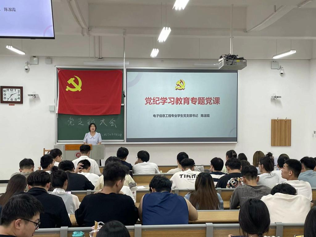为引导学生党员进一步树牢纪律意识和规矩意识,2024年6月15日在17101教室,电子信息工程专业学生党支部开展党纪学习教育专题党课,全体党员参加了党课培训。