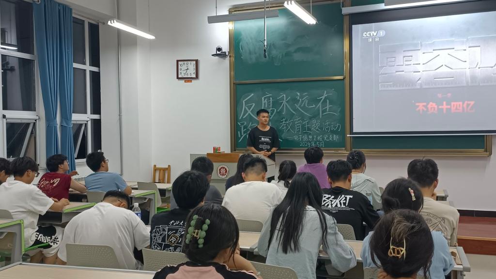 为进一步推动党纪学习教育走深走实,提升学生党员廉洁自律意识,筑牢拒腐防变的思想根基,2024年5月23日在18103教室,电子信息工程专业学生党支部组织党员集中观看了警示教育纪录片《零容忍》。