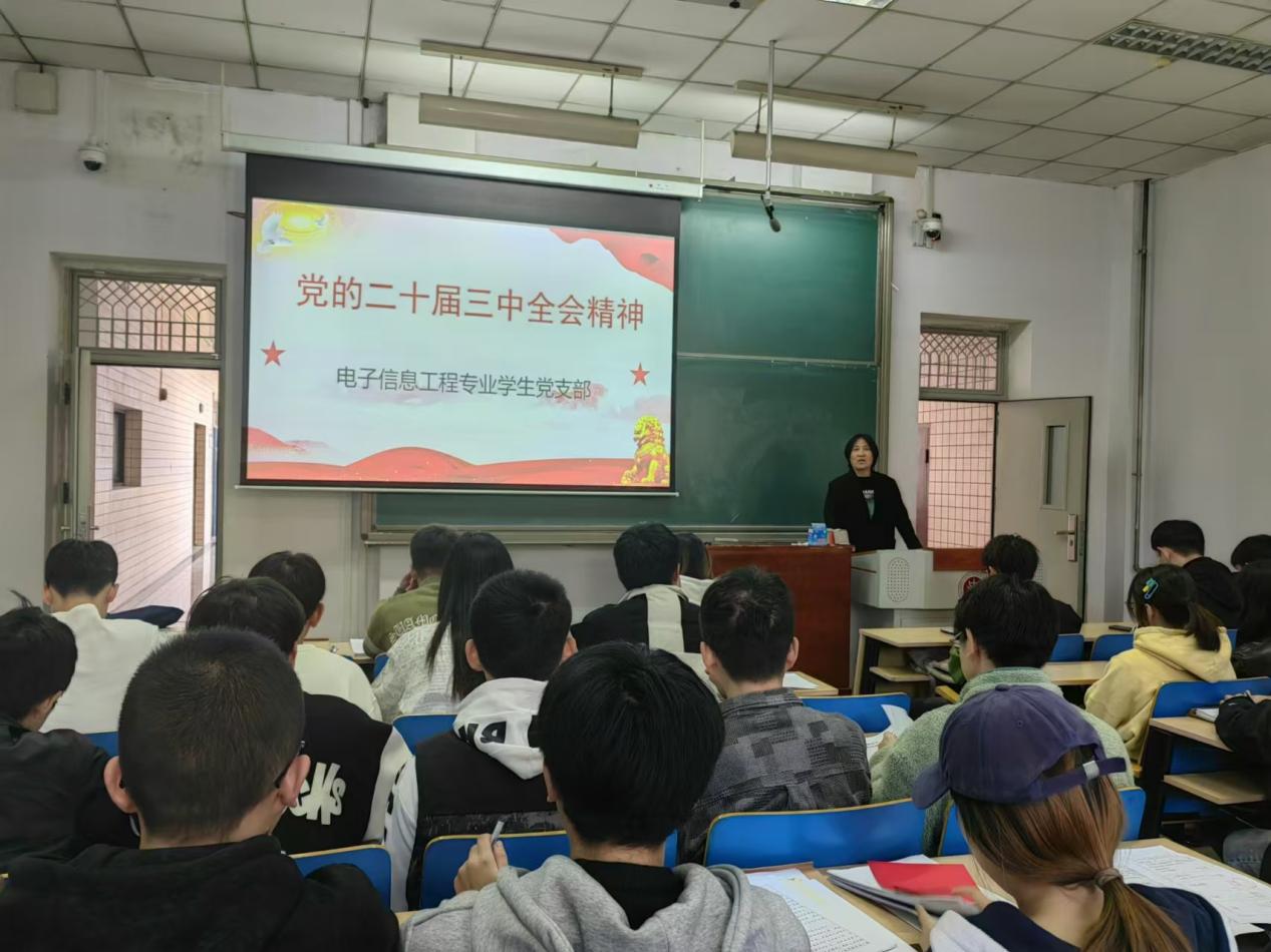 为深入学习贯彻党的二十届三中全会精神,2024年10月22日,在11310H教室,电子信息工程专业学生党支部开展“党的二十届三中全会精神”专题党课,由党支部书记陈淑霞老师主讲。