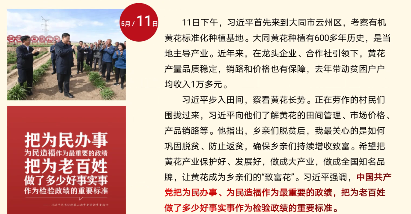 其次,陈老师带领全体师生党员重温了总书记视察山西的足迹。总书记走进田间地头,了解农业特色产业种植发展情况;坐在农家炕头,问询搬迁百姓的生活和收入。温暖的关怀,深切的期望,有惦念,有欣慰,更有鼓励。脱贫攻坚是习近平总书记心里始终最牵挂的一件大事。“今年是决战决胜脱贫攻坚和全面建成小康社会的收官之年,要千方百计巩固好脱贫攻坚成果,接下来要把乡村振兴这篇文章做好,让乡亲们生活越来越美好。”习近平总书记视察山西重要讲话重要指示激励鼓舞我们师生党员,以更大决心、更强力度坚决完成脱贫攻坚目标任务,千方百计巩固和拓展产业就业扶贫成果,推动脱贫攻坚与乡村振兴有机衔接。除此之外,也应该做到坚决维护党的领导,在日程的生活工作中积极发挥带头作用。