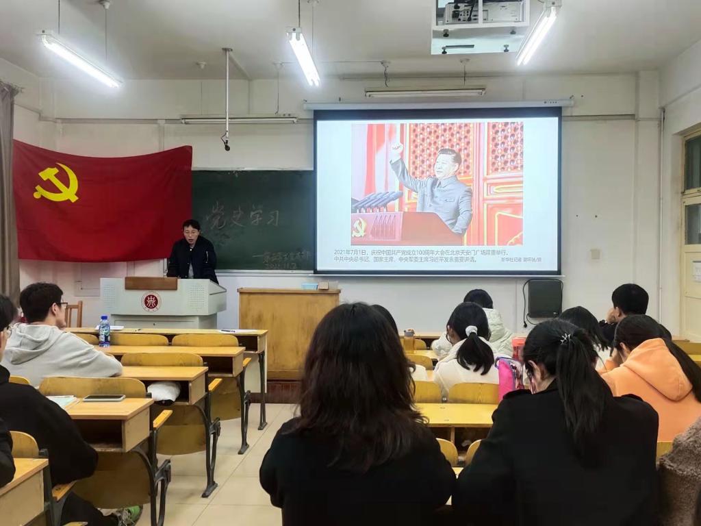 在中国共产党波澜壮阔的百年征程中,无数革命烈士,为了同一个信仰,视死如归、奋斗终身。他们身上的精神力量,穿越时空,为后人树立起理想信念的标杆,激励一代代共产党人奋勇前行。初心因实践而永恒,使命因担当而伟大。2021年11月2日,第五学生党支部开展了党史学习教育专题党课,党支部书记闫霞老师做了学党史 强信念 跟党走的主题宣讲,第五学生党支部全体党员参加了此次学习。
