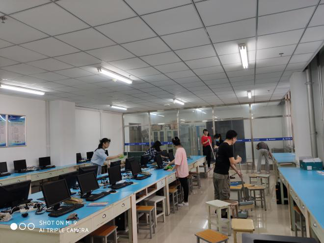 在科学楼门前、无损检测楼附近,同志们分工有序、热情高涨。大家齐心协力,配合默契,铲的铲、推的推、扫的扫,忙碌的身影构成了一道亮丽的风景线。经过大家的齐心奋战,道路变得干净,为师生的通行提供了便利;实验室里,也是一片忙碌的景象,有的在擦洗工作台,有的擦拭实验箱,有的扫地,有的墩地,经过大家辛勤劳动,实验室窗明几净,营造了干净整洁的校园环境,迎接学生入校。